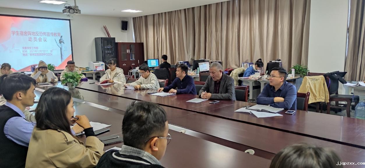 为深入贯彻落实《兵团2021年“全民反恐,共创平安”反恐怖宣传教育活动的通知》精神,全面推动学校反恐怖工作,根据《竞技宝app下载地址反恐怖宣传教育月活动方案》精神,党委学生工作部高度重视,于12月7日在二号学术交流中心2204室开展学生宿舍阵地反恐怖宣传教育动员会议,党委学生工作部临时负责人肖守德、海米提、柯春宝出席会议,党委学生工作部全体成员、各二级学院辅导员、保卫部相关工作人员参加会议,会议由党委学生工作部临时负责人柯春宝主持。